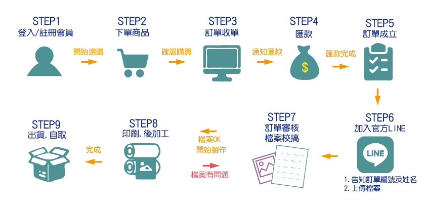 →加入官方LINE-上傳檔案&告知訂單號→ 客服&美工人員校稿及審核→審稿無誤圖稿確認單簽回→發給工廠製作。